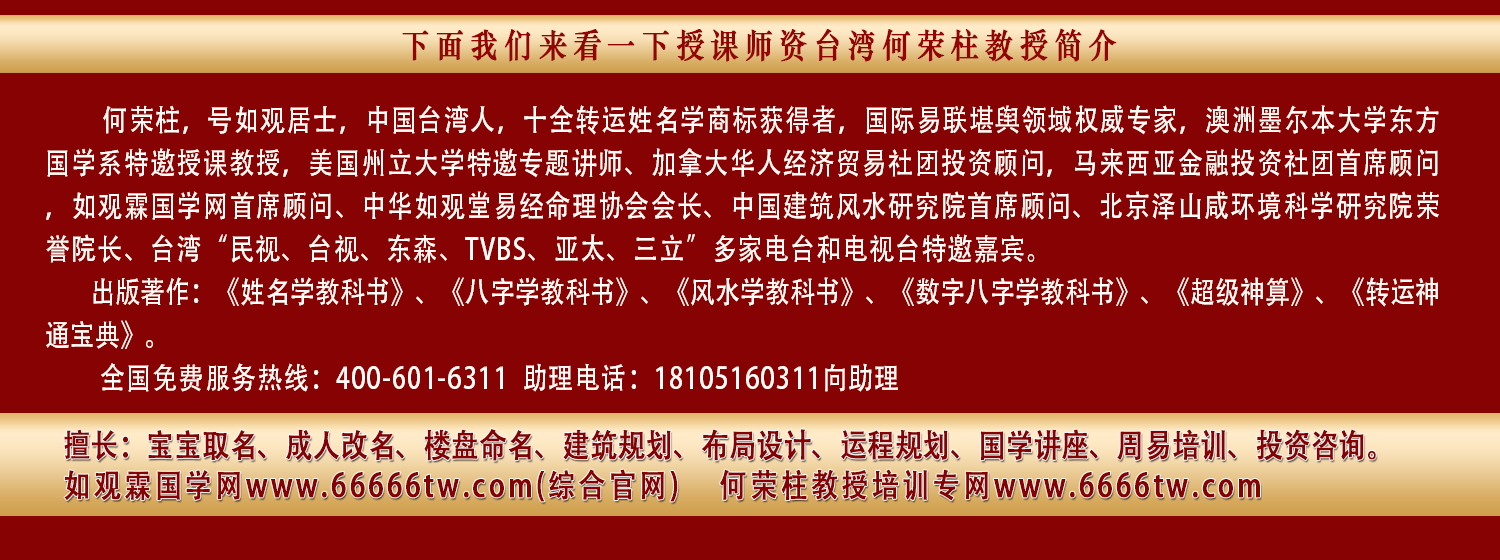 本网站是亚洲易学界名师台湾何荣柱教授在大陆地区官方网站。主营:各类取名业务、企业风水策划、人生规划、商务咨询、品牌思维指导、企业战略布局、开运LOGO设计、国学周易传承等:何荣柱教授强调破除迷信宿命、提倡正确的知名、遵命方式!从而达到创造和谐社会和幸福人生的目的。